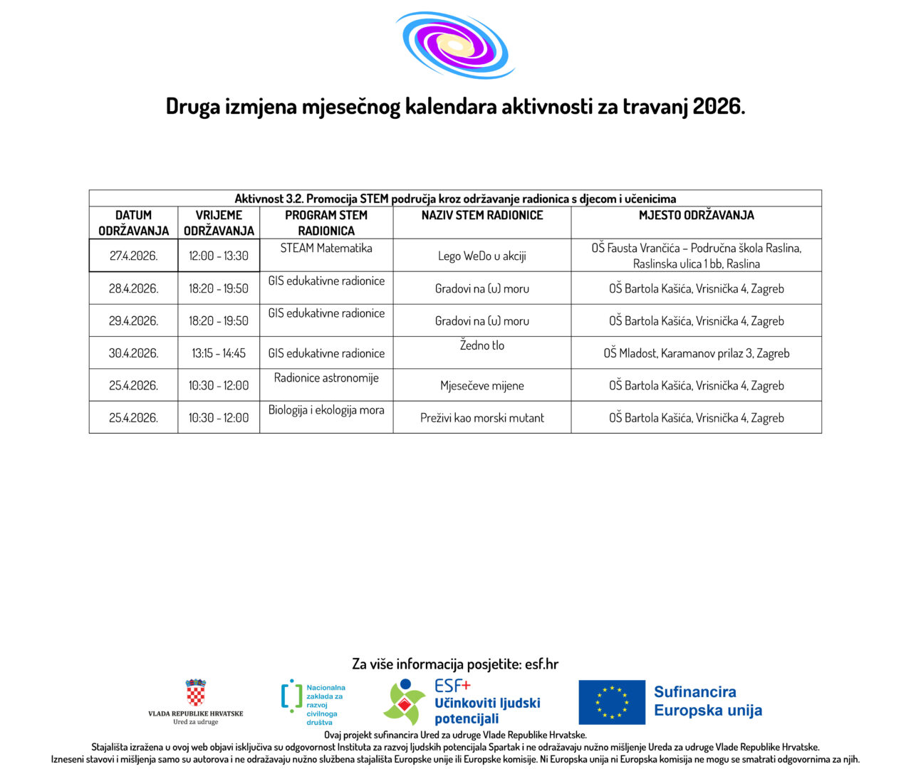 U prilogu možete pogledati drugu izmjenu Mjesečnog kalendara aktivnosti za travanj 2026. godine u sklopu ESF+ projekta „STEM Learning Network“ (SF.2.4.06.04.0081) ukupne vrijednosti od 297.557,55 eura, od čega bespovratna sredstva iznose 295.480,70 eura, a iznos EU sufinanciranja 251.158,59 eura. Provedba projekta će trajati u razdoblju od 20. ožujka 2025. do 20. ožujka 2027. godine. Prijavitelj je Institut za razvoj ljudskih potencijala Spartak. Partneri na projektu su: Krugovi, centar za edukaciju, savjetovanje i humanitarno djelovanje, Institut Ruđer Bošković, Sveučilište Algebra Bernays, Osnovna škola Hvar, Osnovna škola Pirovac, Osnovna škola Jakova Gotovca i Osnovna škola Mladost.