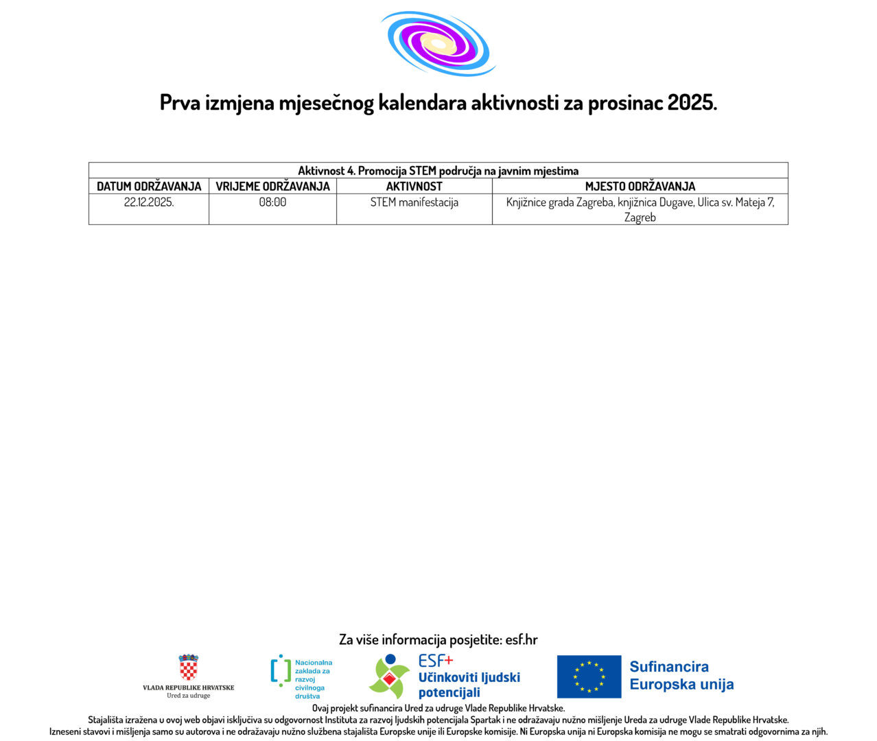 U prilogu možete pogledati izmjenu mjesečnog kalendara aktivnosti za prosinac 2025. godine u sklopu ESF+ projekta „STEM Learning Network“ (SF.2.4.06.04.0081) ukupne vrijednosti od 297.557,55 eura, od čega bespovratna sredstva iznose 295.480,70 eura, a iznos EU sufinanciranja 251.158,59 eura. Provedba projekta će trajati u razdoblju od 20. ožujka 2025. do 20. ožujka 2027. godine. Prijavitelj je Institut za razvoj ljudskih potencijala Spartak. Partneri na projektu su: Krugovi, centar za edukaciju, savjetovanje i humanitarno djelovanje, Institut Ruđer Bošković, Sveučilište Algebra Bernays, Osnovna škola Hvar, Osnovna škola Pirovac, Osnovna škola Jakova Gotovca i Osnovna škola Mladost.