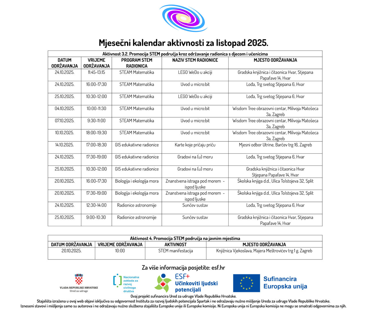 U prilogu možete pogledati Mjesečni kalendar aktivnosti za listopad 2025. godine u sklopu ESF+ projekta „STEM Learning Network“ (SF.2.4.06.04.0081) ukupne vrijednosti od 297.557,55 eura, od čega bespovratna sredstva iznose 295.480,70 eura, a iznos EU sufinanciranja 251.158,59 eura. Provedba projekta će trajati u razdoblju od 20. ožujka 2025. do 20. ožujka 2027. godine.