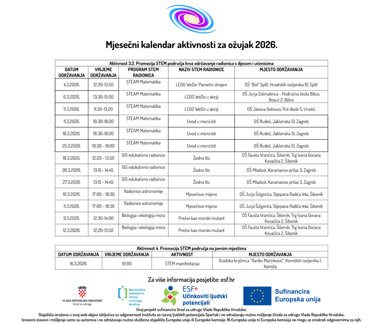 U prilogu možete pogledati Mjesečni kalendar aktivnosti za ožujak 2026. godine u sklopu ESF+ projekta „STEM Learning Network“ (SF.2.4.06.04.0081) ukupne vrijednosti od 297.557,55 eura, od čega bespovratna sredstva iznose 295.480,70 eura, a iznos EU sufinanciranja 251.158,59 eura. Provedba projekta će trajati u razdoblju od 20. ožujka 2025. do 20. ožujka 2027. godine. Prijavitelj je Institut za razvoj ljudskih potencijala Spartak. Partneri na projektu su: Krugovi, centar za edukaciju, savjetovanje i humanitarno djelovanje, Institut Ruđer Bošković, Sveučilište Algebra Bernays, Osnovna škola Hvar, Osnovna škola Pirovac, Osnovna škola Jakova Gotovca i Osnovna škola Mladost.