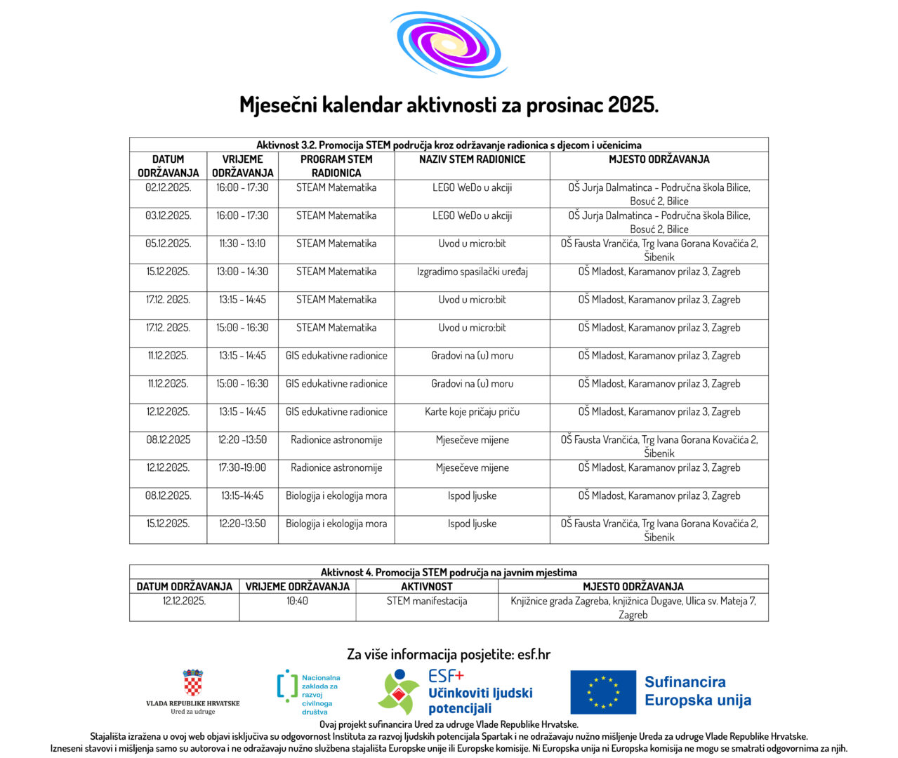 U prilogu možete pogledati Mjesečni kalendar aktivnosti za studeni 2025. godine u sklopu ESF+ projekta „STEM Learning Network“ (SF.2.4.06.04.0081) ukupne vrijednosti od 297.557,55 eura, od čega bespovratna sredstva iznose 295.480,70 eura, a iznos EU sufinanciranja 251.158,59 eura. Provedba projekta će trajati u razdoblju od 20. ožujka 2025. do 20. ožujka 2027. godine. Prijavitelj je Institut za razvoj ljudskih potencijala Spartak. Partneri na projektu su: Krugovi, centar za edukaciju, savjetovanje i humanitarno djelovanje, Institut Ruđer Bošković, Sveučilište Algebra Bernays, Osnovna škola Hvar, Osnovna škola Pirovac, Osnovna škola Jakova Gotovca i Osnovna škola Mladost.