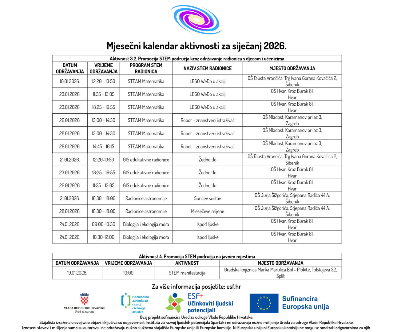 U prilogu možete pogledati Mjesečni kalendar aktivnosti za siječanj 2025. godine u sklopu ESF+ projekta „STEM Learning Network“ (SF.2.4.06.04.0081) ukupne vrijednosti od 297.557,55 eura, od čega bespovratna sredstva iznose 295.480,70 eura, a iznos EU sufinanciranja 251.158,59 eura. Provedba projekta će trajati u razdoblju od 20. ožujka 2025. do 20. ožujka 2027. godine. Prijavitelj je Institut za razvoj ljudskih potencijala Spartak. Partneri na projektu su: Krugovi, centar za edukaciju, savjetovanje i humanitarno djelovanje, Institut Ruđer Bošković, Sveučilište Algebra Bernays, Osnovna škola Hvar, Osnovna škola Pirovac, Osnovna škola Jakova Gotovca i Osnovna škola Mladost.