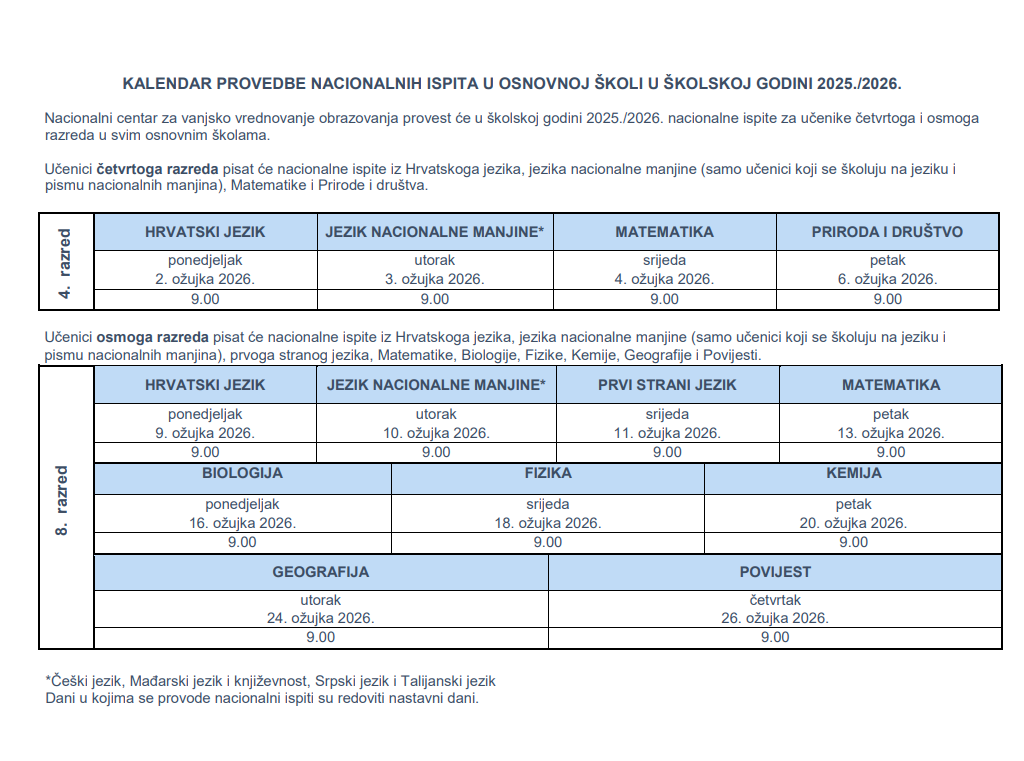 Nacionalni ispiti za učenike 4. razreda započinju u ponedjeljak, 2. ožujka 2026. godine, i pišu se prema sljedećem rasporedu: