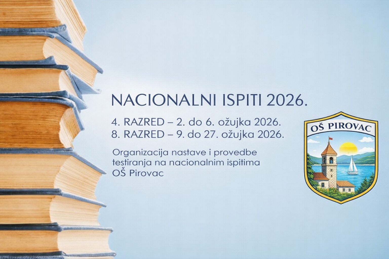 Sljedeći tjedan u našoj školi počinje provedba nacionalnih ispita za učenike 4. i 8. razreda. Riječ je o redovitoj aktivnosti sustava obrazovanja kojom se prati postignuće učenika i kvaliteta rada škola na nacionalnoj razini.